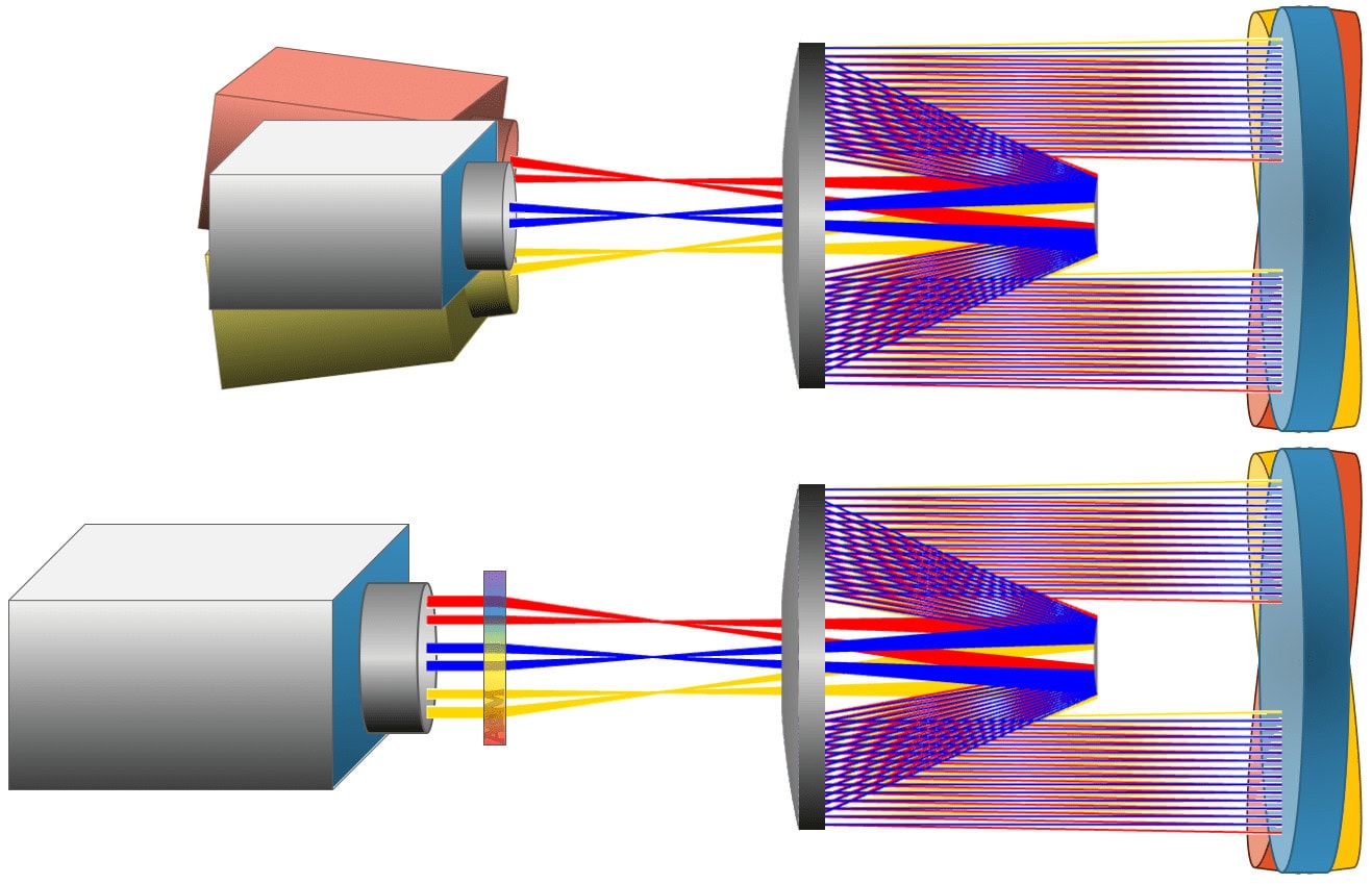 Bottom: A CGH adjusts the input wavefront to enable a collimated output wavefront, enabling infinite conjugate testing of the subsystem.
