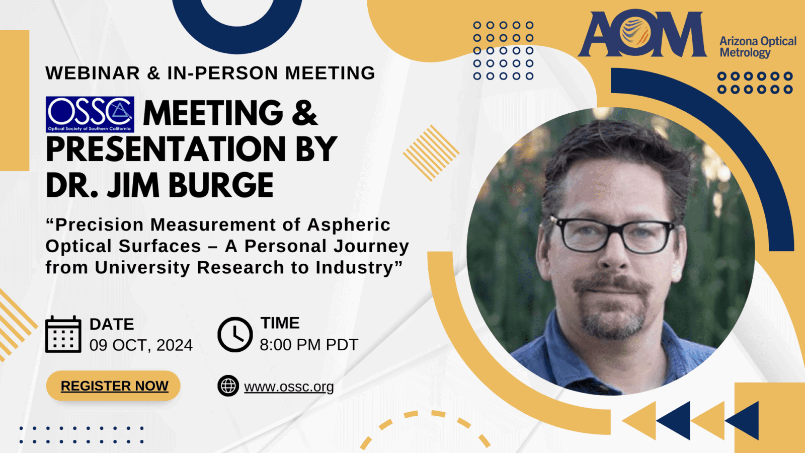Join the Optical Society of Southern California (OSSC) this October for an insightful technical presentation by AOM president, Dr. Jim Burge! Dr. Burge will be sharing his talk, “Precision Measurement of Aspheric Optical Surfaces – A Personal Journey from University Research to Industry.” Discover the fascinating evolution of precision metrology as Dr. Burge takes us through his experiences, from groundbreaking university research to the latest innovations in the optical industry. Read on for the abstract and Dr. Burge’s bio!