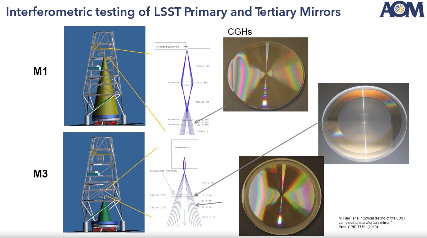 AOM co-founder Dr. Chunyu Zhao supported the metrology by providing three different computer-generated holograms (CGHs): one to certify the PM null lens, and two more for directly testing and certifying the tertiary mirror.