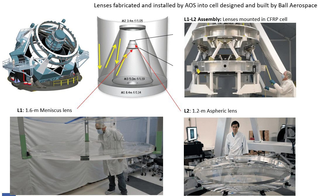 These optics were fabricated, measured, and assembled at Arizona Optical Systems (AOS), co-founded by Jim Burge. Computer-generated holograms from AOM were used to measure the surfaces of the lenses, the lens alignment in the carbon fiber cell, and the final transmitted wavefront for the assembly.