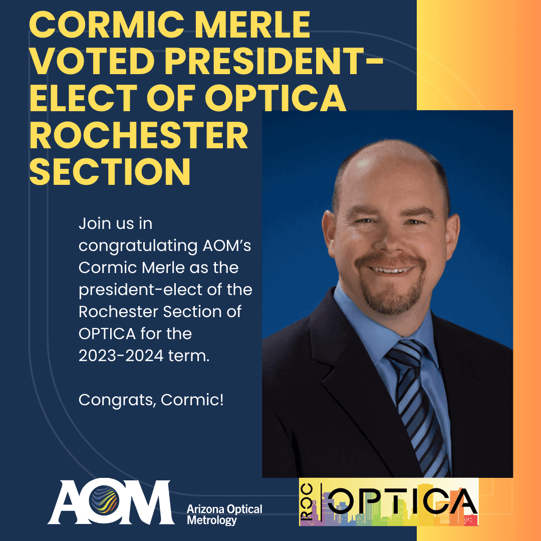 We are proud to announce that Cormic Merle, our Director of Metrology Systems at AOM Rochester, has been elected as the President-Elect of the Rochester Section of OPTICA for the 2023-2024 term. Cormic has been active in the Rochester Section for several years and has at times been a council member, serving as a House Co-chair and Program Co-chair. He has also been involved in various outreach and educational activities to promote optics in the Rochester community.