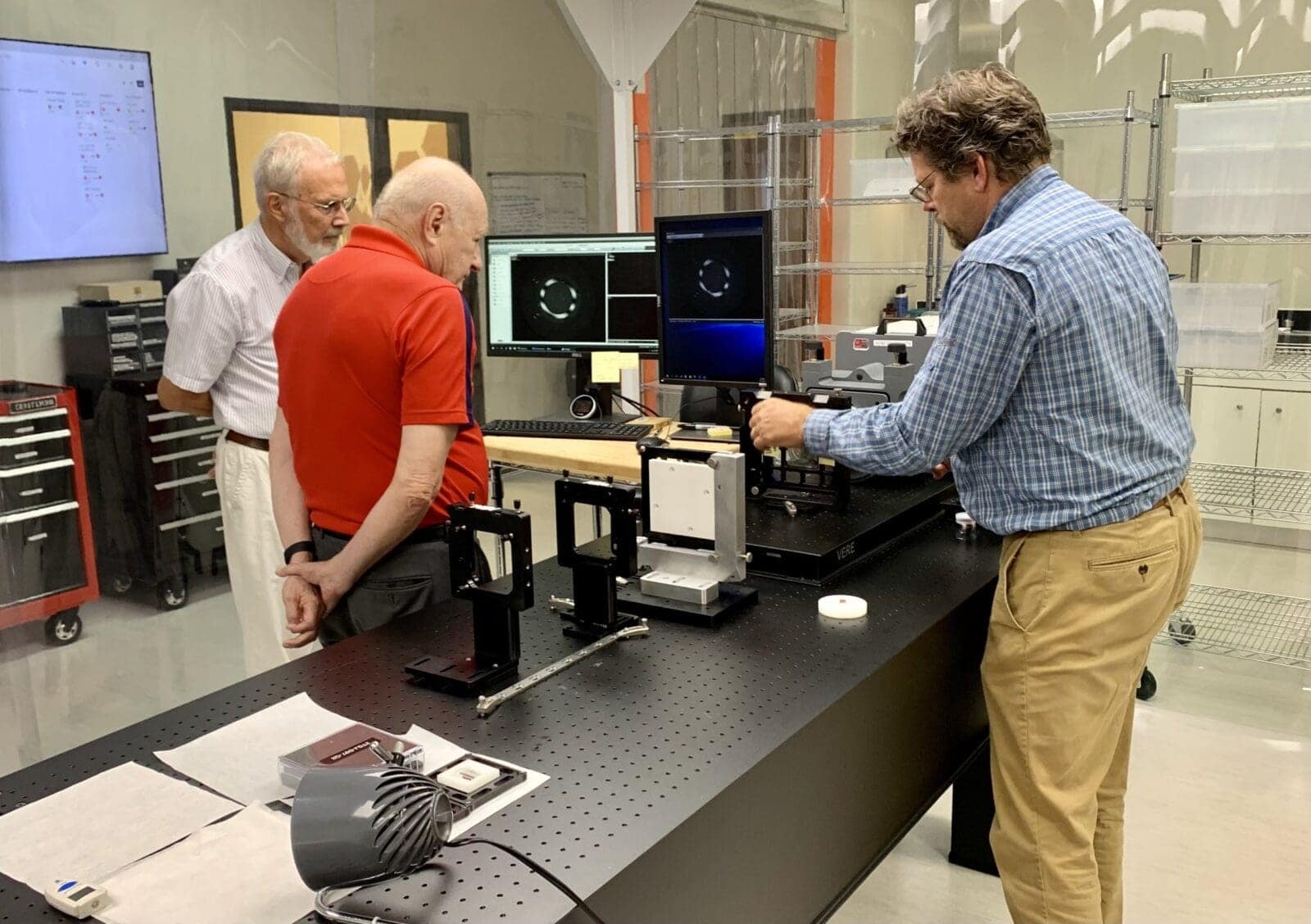 Arizona Optical Metrology makes CGH null testing easy, but wasn’t always that way. Dr. Jim Wyant, founding dean of the College of Optical Sciences at University of Arizona, pioneered the metrology applications of Computer Generated Holograms in the early 1970’s. AOM was honored to host Dr. Wyant on August 11. He visited our facility in Tucson and shared some stories about the early CGH development when computers were limited and direct-write lithography was not available. His holograms were challenging to design and were plotted onto paper and photoreduced onto film. He knew all about CGH testing for high-end projects like space telescopes and lithography optics, but he was surprised and delighted to see how AOM technical advances and economies of scale have made CGH testing accessible to such a wide range of applications. As for the future, he said “We just need to get the word out.”