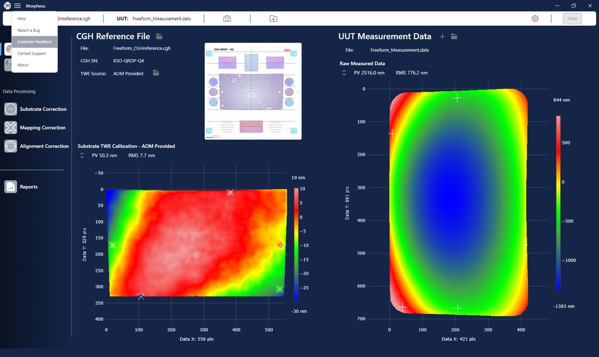 To report feedback on Morpheus™, such as improvements, requests for new features, or general comments, please use our feedback form. This form can be accessed by clicking the menu button in the Morpheus™ titlebar and selecting ‘Customer Feedback’. This will open a new browser window or tab with the AOM feedback form. Please fill out the form and click ‘Submit’ to send your feedback to AOM. We appreciate your feedback and will use it to improve Morpheus™ in the future. See below for how to access the feedback form in Morpheus™.