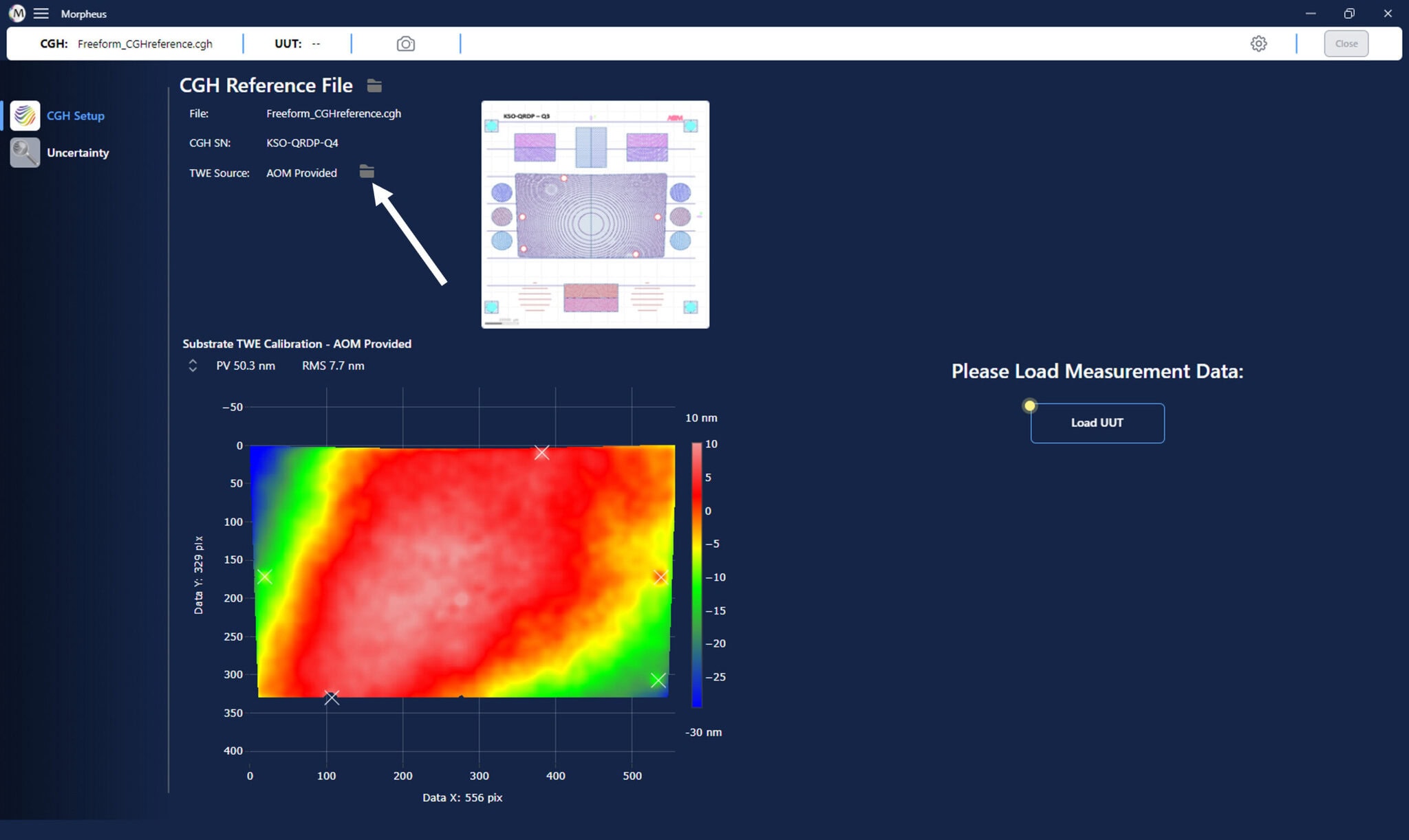 - The input UUT surface error map is shown in the left panel of the Morpheus™ graphics window.