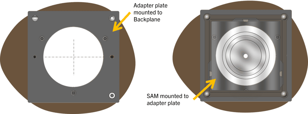 SAM adapter plate mounted to telescope backplane (left). SAM mounted to adapter plate (right).