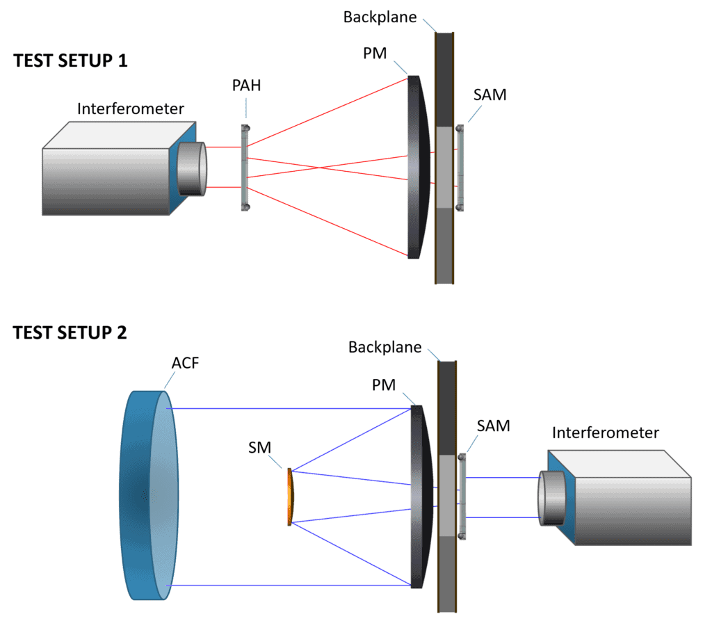 PM/SM subassembly in a traditional field point test with interferometer positioned at multiple field points, and auto-collimating flat (ACF) tilted to return field angles.