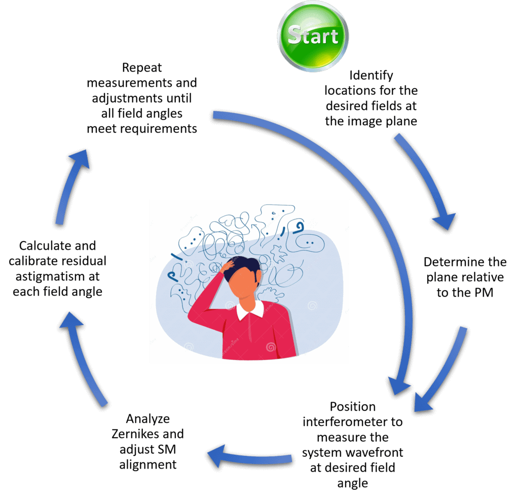 Testing field points traditionally requires positioning the interferometer to various field points, adjustment of the corrector optics, as well as scanning of field angles using an auto-collimating flat (ACF). These methods drive complexity, and potentially cost, of aligning a system of several optical elements. A brief description of traditional alignment methods and their limitations is shown below for illustration.