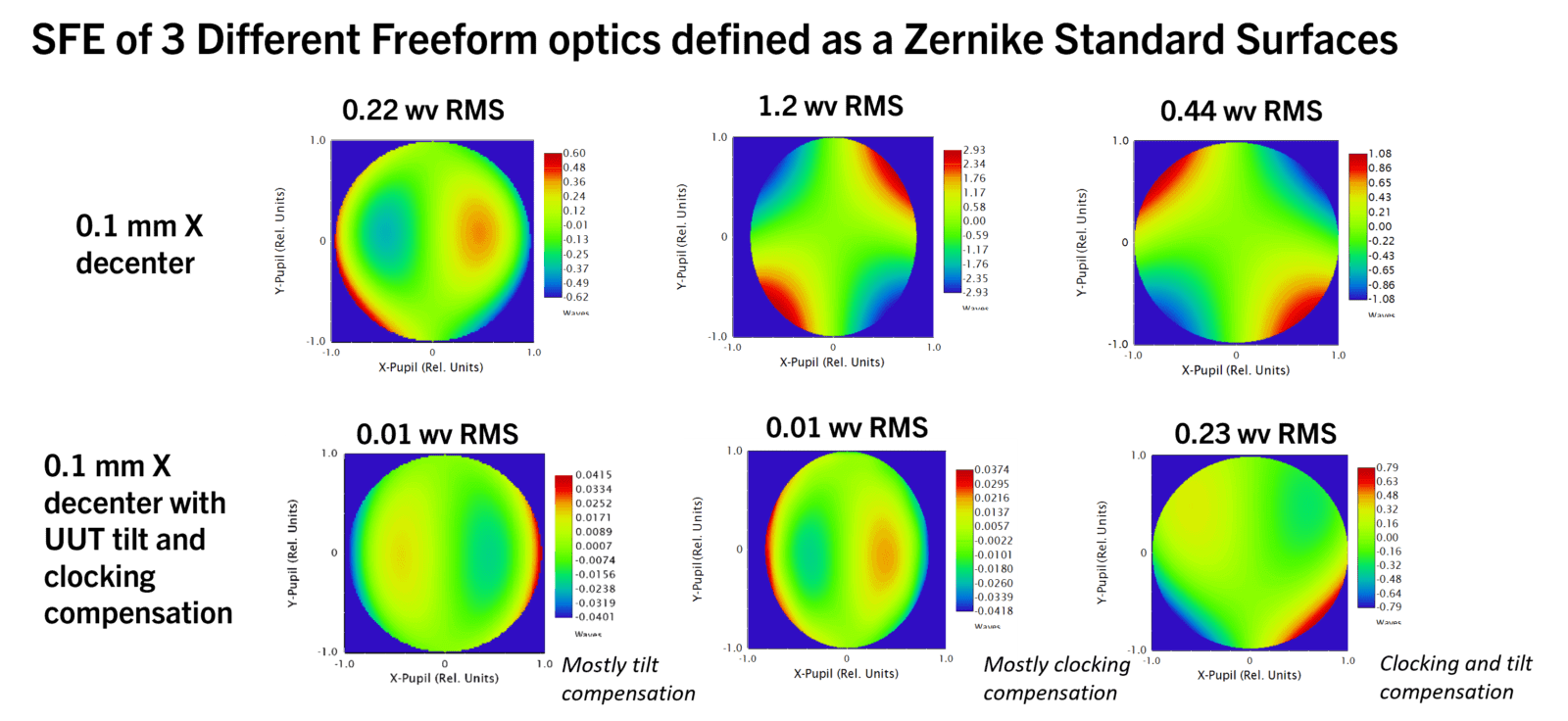 Below are three examples of different freeform surfaces, described by the Zernike Standard coefficient basis. The surface figure error when all 3 optics undergo the same X decenter misalignment is shown on the top row, and the residual surface figure error after compensating with other alignment degrees of freedom (tilt, clocking) is shown on the bottom row.