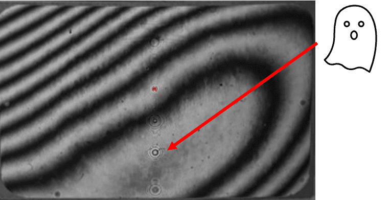 Ghosts can show up as hotspots in data and typically look like dense bullseye-shaped fringes.