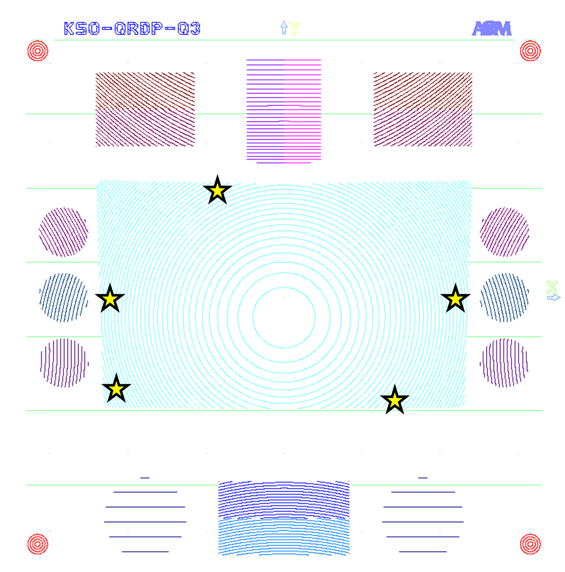 AOM typically includes a set of fiducial dots on its patterns. These dots serve a variety of purposes: